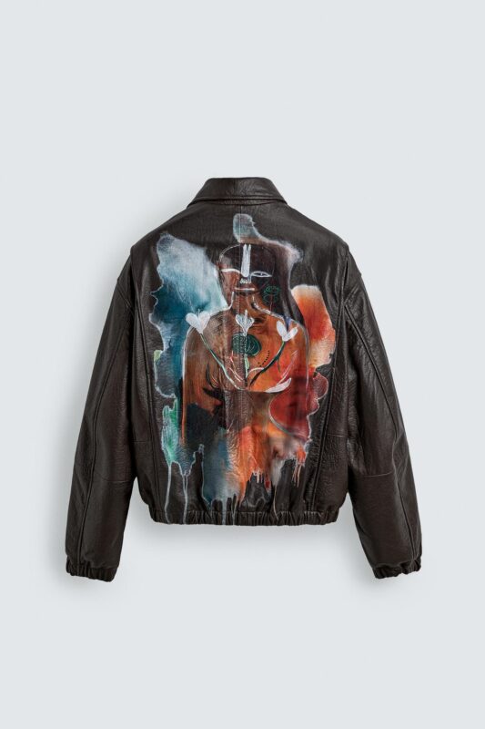 His visual language carries through the entire line. Prints, embroideries, and jacquards echo his paintings—sometimes quietly placed, sometimes taking over the garment. The result is a collection that doesn’t just reference art, but behaves like it.