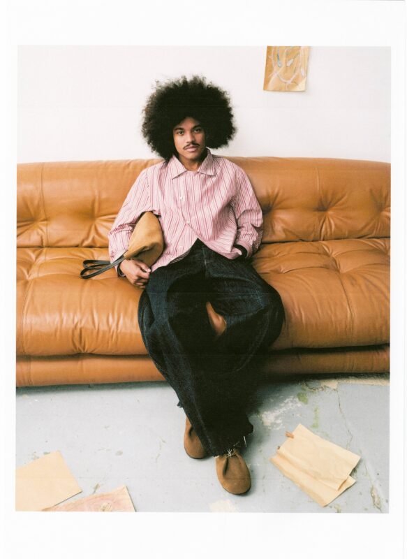 What sets this collaboration apart is how closely it mirrors Saboia’s own life. Some garments are direct reinterpretations of items from his personal wardrobe, including a shirt originally owned by his grandmother. Others borrow from his studio practice, incorporating functional details like brush pockets—subtle, but telling.